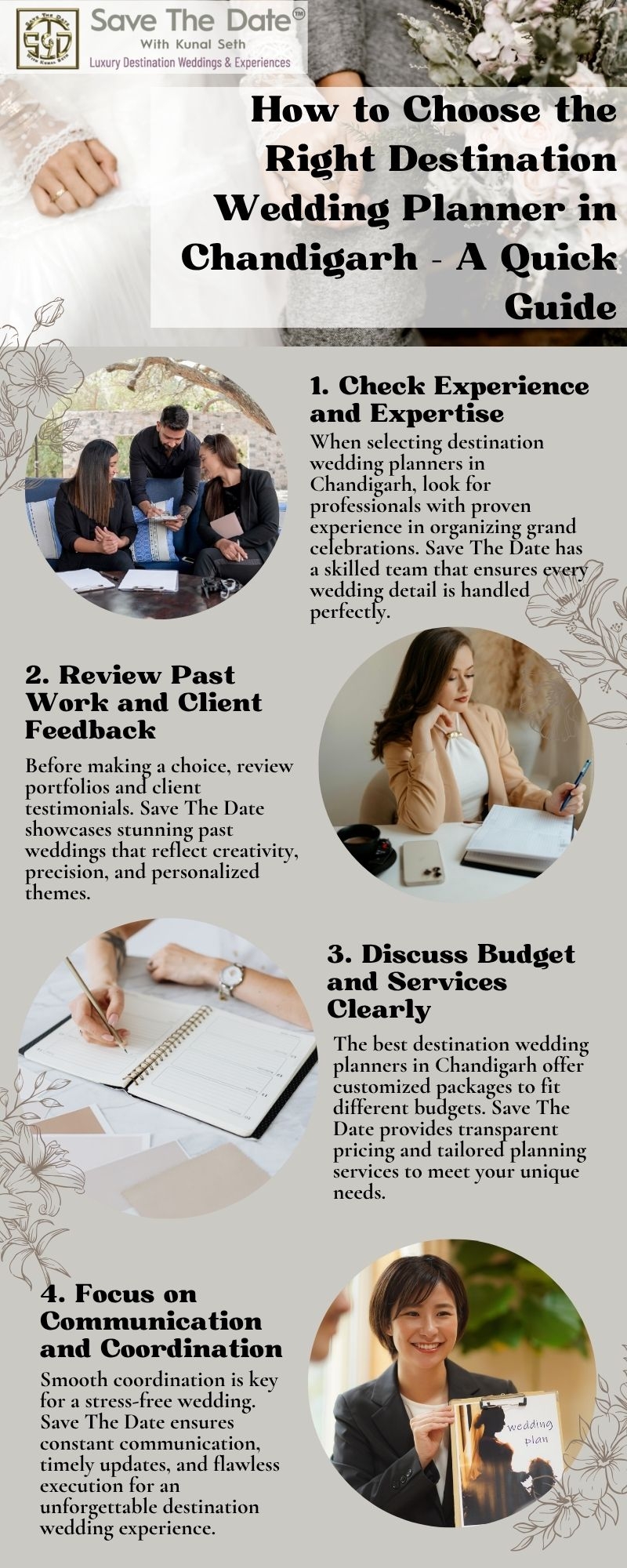 How to Choose the Right Destination Wedding Planner in Chandigarh – A Quick Guide 1. Check Experience and Expertise When selecting destination wedding planners in Chandigarh, look for professionals with proven experience in organizing grand celebrations. Save The Date has a skilled team that ensures every wedding detail is handled perfectly. 2. Review Past Work and Client Feedback Before making a choice, review portfolios and client testimonials. Save The Date showcases stunning past weddings that reflect creativity, precision, and personalized themes. 3. Discuss Budget and Services Clearly The best destination wedding planners in Chandigarh offer customized packages to fit different budgets. Save The Date provides transparent pricing and tailored planning services to meet your unique needs. 4. Focus on Communication and Coordination Smooth coordination is key for a stress-free wedding. Save The Date ensures constant communication, timely updates, and flawless execution for an unforgettable destination wedding experience. Visit Here - https://kunalseth.in/
